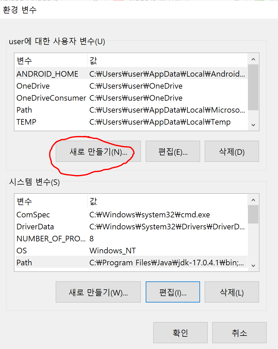 - 사용자 변수 편집 후 확인 클릭 (안드로이드 스튜디오 다운로드 하실때 설정을 건들지 않으셨으면 저랑 똑같이 작성 하시면 됩니다)