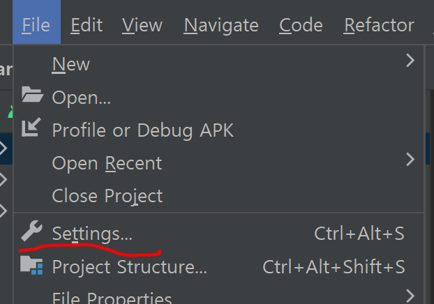 - 안드로이드 스튜디오 실행 -> 맨 왼쪽 상단에 File 클릭 -> Settings 클릭