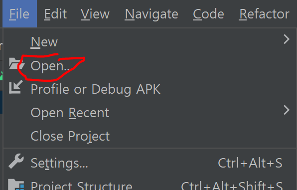 - React Native 추가 되었으면 안드로이드 스튜디오 실행 후 File -> Open 클릭