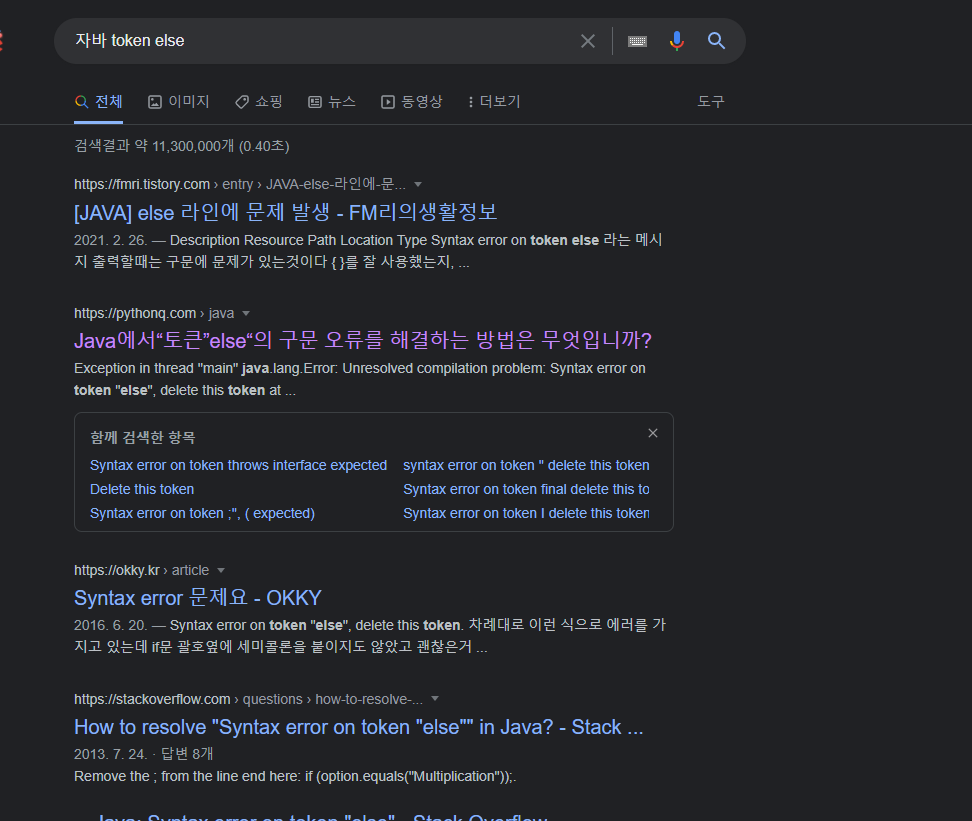 10여분간 스펠링이 틀린곳은 없는지 책이랑은 다른게 쓴곳은 없는지 고민을 하다가 못 찾고 있었는데 문득 개발자는 프로 구글러라는 이야기가 떠올라 바로 구글에 자바 token else 라고 검색을 한 결과