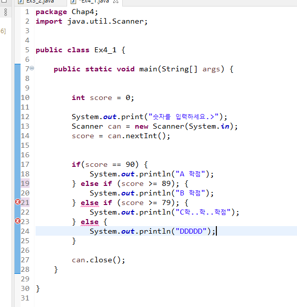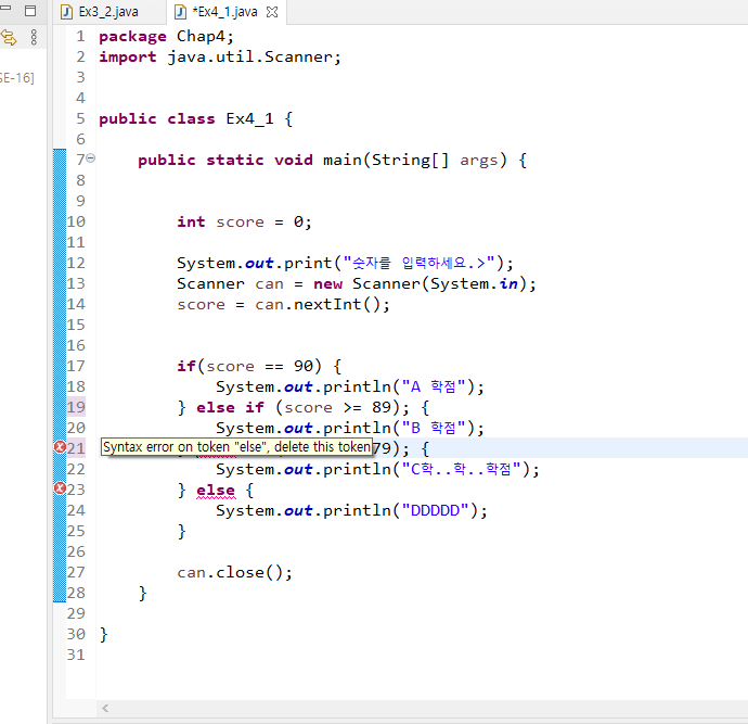 자바 수업을 들은지 오늘로 4일째.... 자바의정석 Chap4에서 if-else if문에서 책과는 다르게 내가 만들어보고 싶어서 예시를 만들던 도중 에러가 났습니다!!
