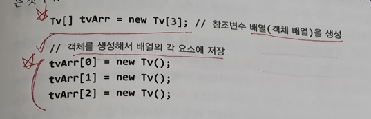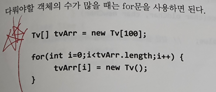 그리고 객체배열을 생성하는 것은 객체를 다루기 위한 참조 변수들이 만들어진 것일 뿐이고 아직 객체가 저장되지는 않았어요 그래서 객체를 생성해서 각 요소에 저장을 해야 돼요!