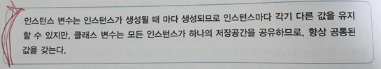 클래스 변수와 인스턴스 변수를 헷갈려하실 거 같아서 예제를 하나 가져왔어요!