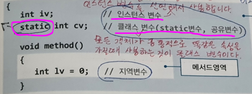 변수에는 클래스 영역에 사용되는 클래스 변수와 인스턴스 변수가 있고 메서드(생성자 내부) 영역에 사용되는 지역변수 이렇게 총 세 가지가 있는데 클래스 변수와 인스턴스 변수를 통틀어 멤버 변수라고 하며, 그 외에는 모두 지역변수라고 한대요 그리고 클래스 변수와 인스턴스 변수의 차이는 static의 유무라고 합니다!
