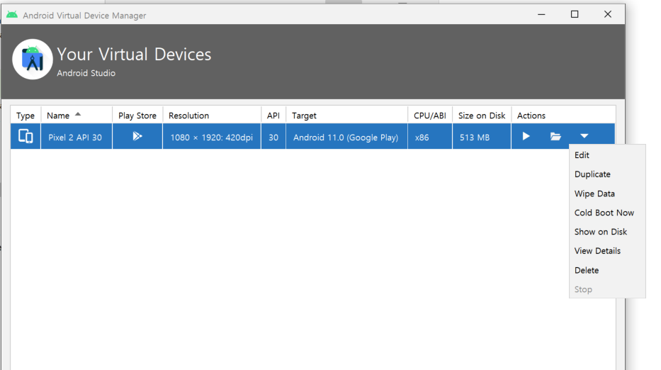 이미지에 보이는 AVD 매니저를 들어가서 Actions 부분 밑에 칸에서 마우스 우 클릭을 한 뒤 View Details 버튼을 클릭하면