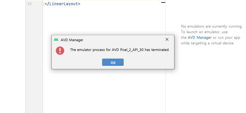 사진처럼 오류가 났어요 해석해 보니 에뮬레이터 프로세스가 종료되었다는 뜻인 거 같아요 오류를 구글링에 검색해 보니 저와 같은 분들이 많이 있어서 다행이네요 휴...