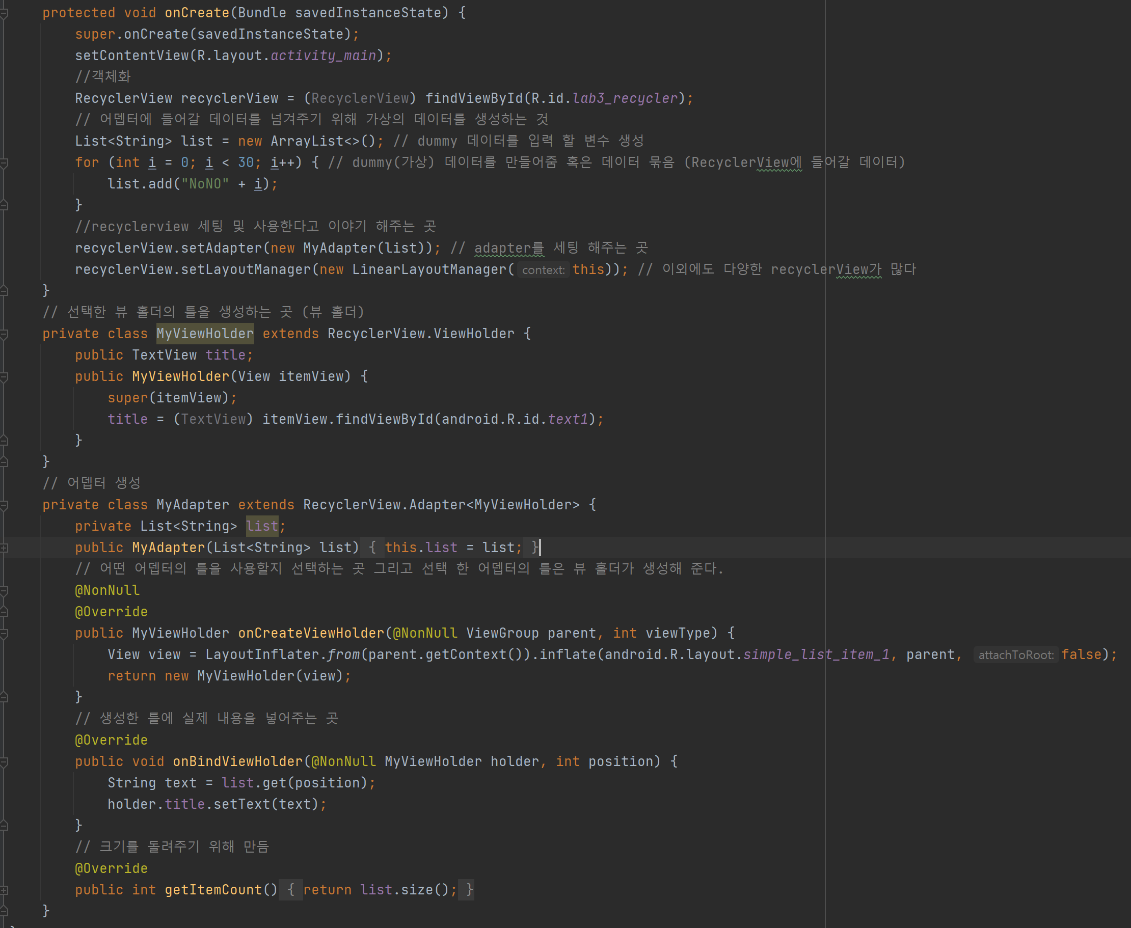 recyclerView.setAdapter(new MyAdapter(list)); // adapter를 세팅 해주는 곳