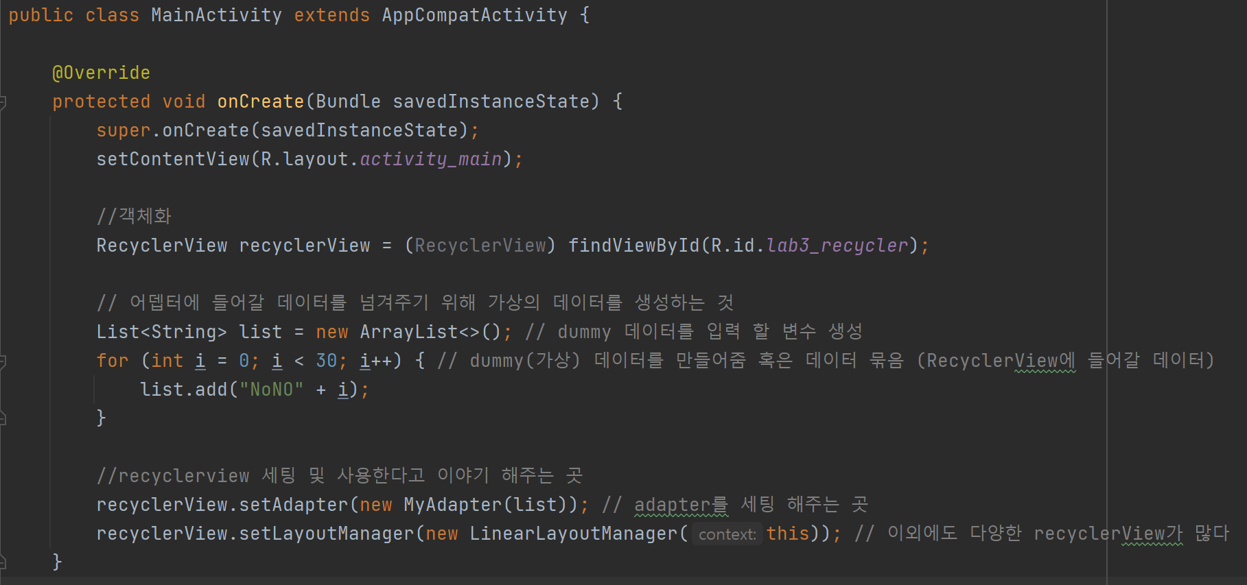 for (int i = 0; i < 30; i++) { // dummy(가상) 데이터를 만들어줌 혹은 데이터 묶음 (RecyclerView에 들어갈 데이터)