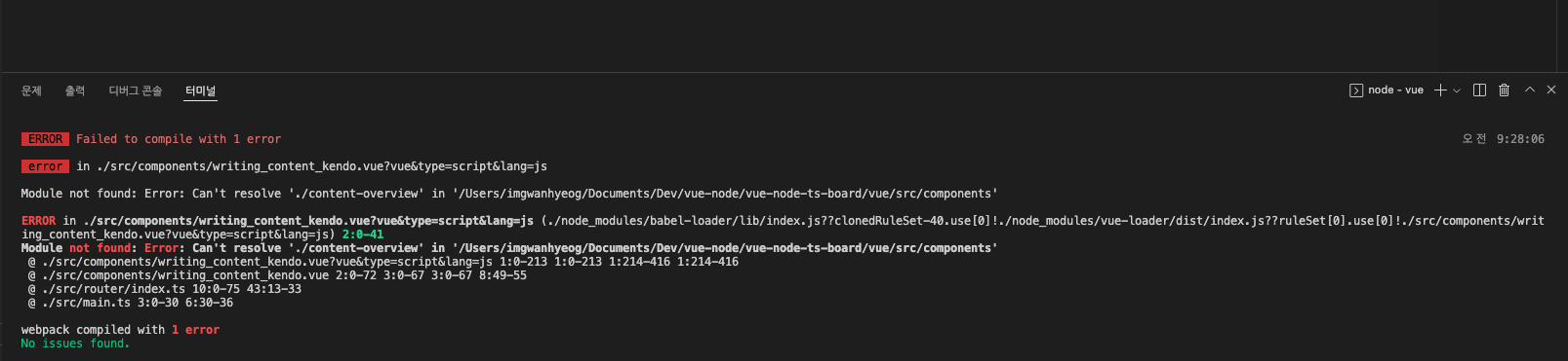 kendo ui 중 editor 기능을 사용하려는 도중 오류가 나서 확인을 해보니 Can't resolve './content-overview' in '/Users/imgwanhyeog/Documents/Dev/vue-node/vue-node-ts-board/vue/src/components' 라는 오류가 나서