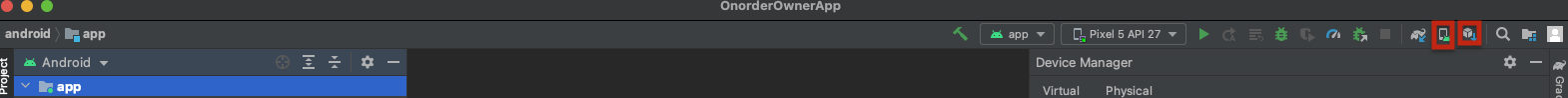 - 환경변수 설정은 모두 끝이 났습니다! 이제 vue add cordova를 설치하면서 생성이 된 src-cordova를 안드로이드 스튜디오로 실행시켜준 뒤 Device Manager를 켜주세요