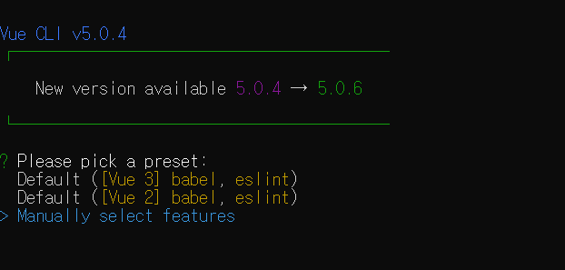- cmd / 터미널에 vue create 파일명 작성 후 엔터를 누르면 사진처럼 나오게 됩니다