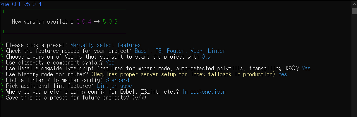 Vue 버전 선택과 (저는 vue3인 3을 선택 했습니다)