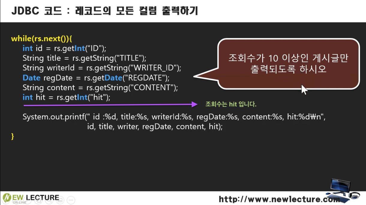 String sql = “SELECT * FROM NOTICE WHERE HIT > 10”;