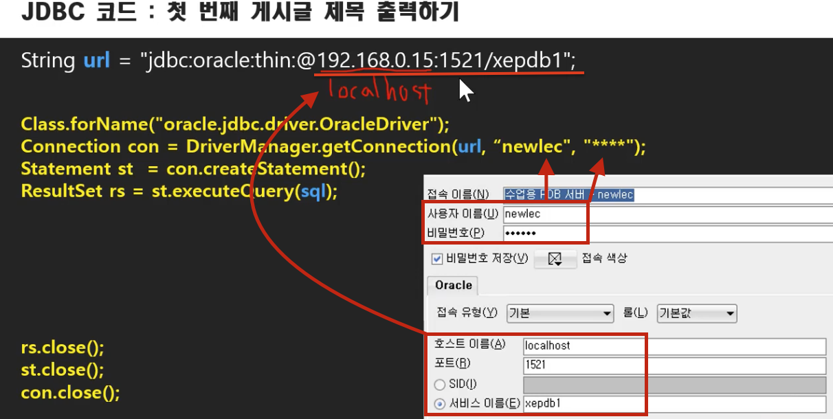 Connection con = DriverManager.getConnection(url, “DBid”, “DBpassword”); - 연결도구